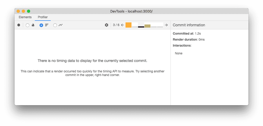 This message indicates that no performance data was recorded for the root that’s selected in the “Elements” panel. In this case, try selecting a different root in that panel to view profiling information for that root: