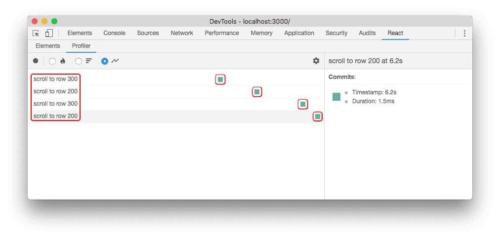 The image above shows a profiling session that traced four interactions. Each row represents an interaction that was traced. The colored dots along the row represent commits that were related to that interaction.