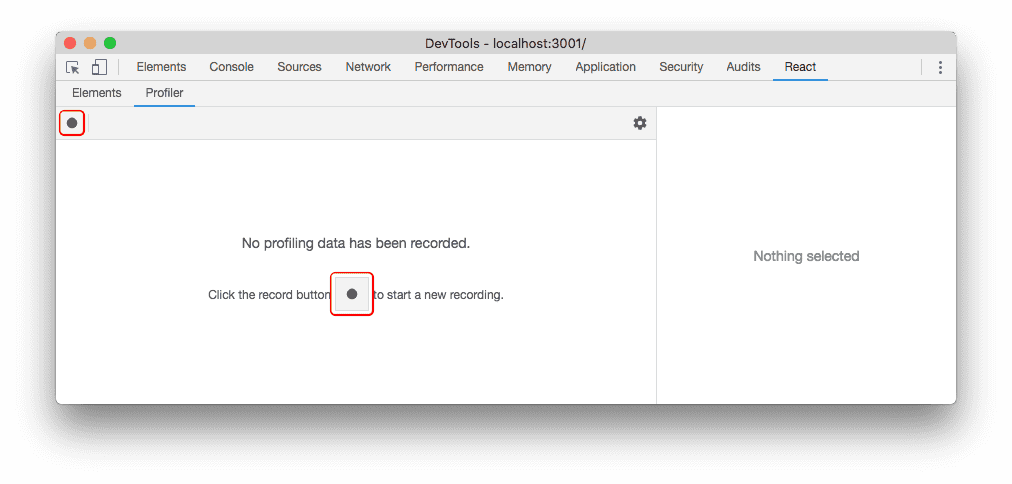 The “Profiler” panel will be empty initially. Click the record button to start profiling: