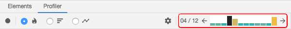 The DevTools profiler groups performance info by commit. Commits are displayed in a bar chart near the top of the profiler: