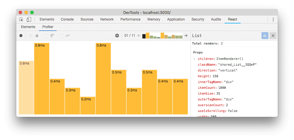 The chart above shows that the List component rendered 11 times.